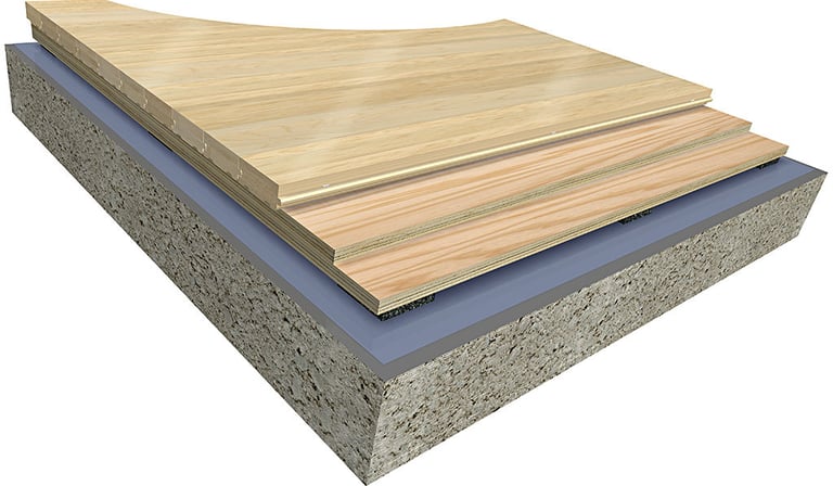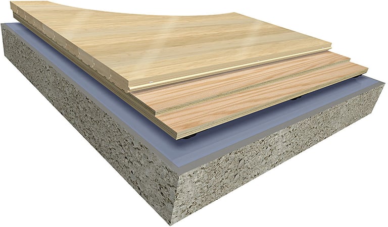 Este sistema de piso flotante resistente de alto rendimiento está diseñado específicamente para superar todos los criterios de rendimiento más altos que esperan los atletas y exigen las instalaciones. Rendimiento certificado para cumplir con las normas MFMA PUR, DIN 18032-2 (2001) y (1991), ASTM F2772, EN y FIBA. El sistema de piso ProAction Thrust cuenta con almohadillas de caucho natural ProAction con respuesta de carga variable, dos capas de revestimiento de contrapiso con clasificación APA de 15/32" y capacidad de 32/16 y piso de arce Action.