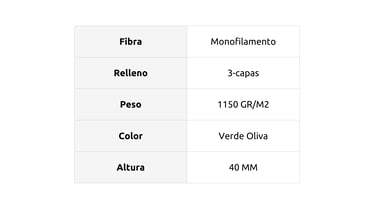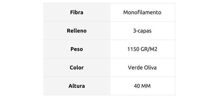 Pasto para uso deportivo fabricado en fibras de monofilamento relleno de 3 capas (layers) contando con peso de 1150 GR/M2 en color verde oliva dando una altura total de 40 MM.