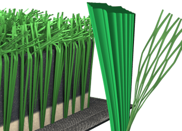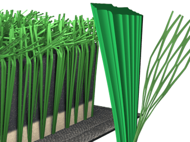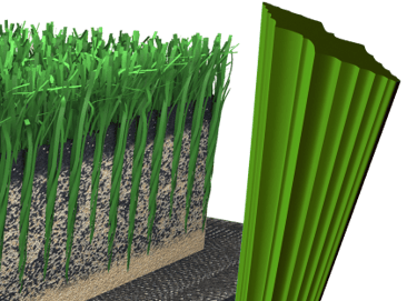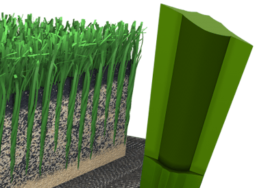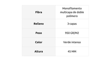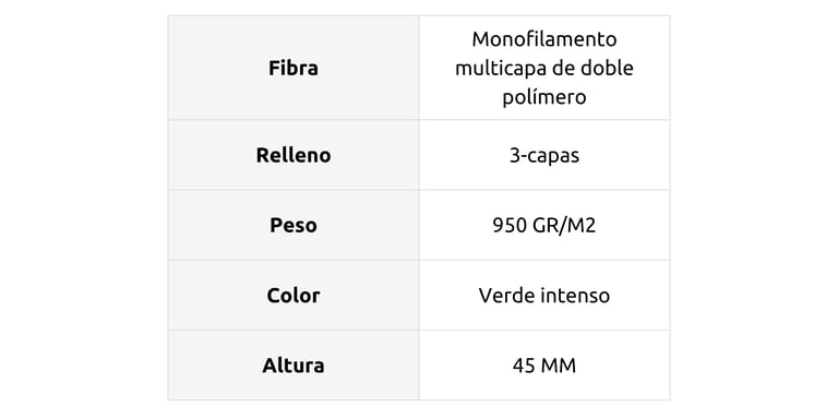 Pasto para uso deportivo fabricado en fibras de monofilamento multicapa de doble polímero relleno de 3 capas (layers) contando con peso de 950 GR/M2 en color verde intenso dando una altura total de 45 MM.
