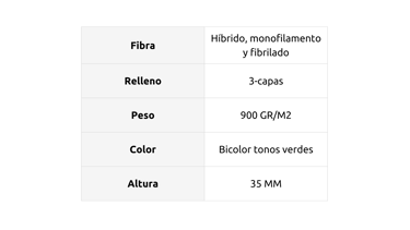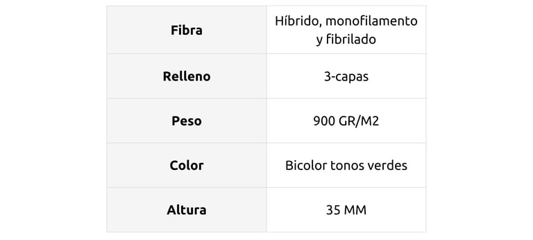 Pasto para uso deportivo híbrido fabricado en fibras de monofilamento y fibrilado relleno de 3 capas (layers) contando con peso de 900 GR/M2 en color bicolor, tonos verde dando una altura total de 35 MM.