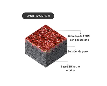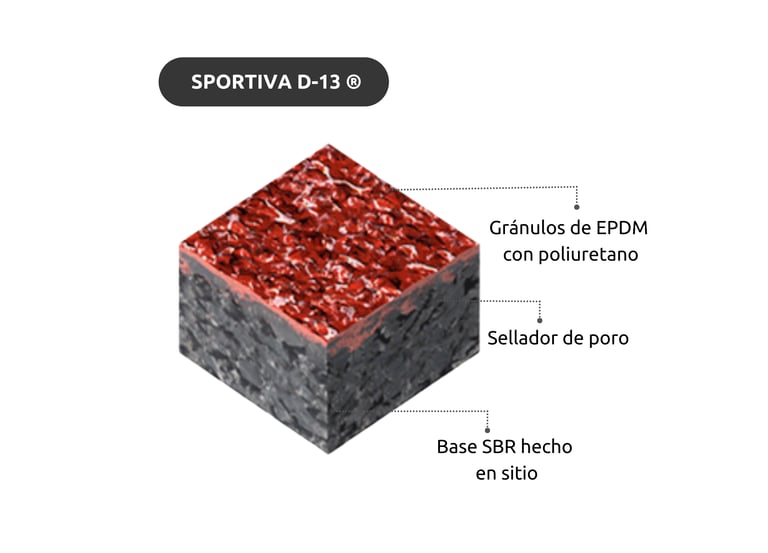 El sistema de superficie SPORTIVA D-13® es un sistema para pistas hecho en sitio duradero resistente a la abrasión, intemperie y a cambios de clima.La pista será fabricada según estándares exigentes, el sistema de dos capas cuenta con una base de SBR aglutinada compactada por máquina paver de tecnología alemana, se sella con un sellador de poros de poliuretano y posteriormente por medio del método SPRAYADO se pone recubrimiento de gránulos EPDM combinado con binder en color a elegir.