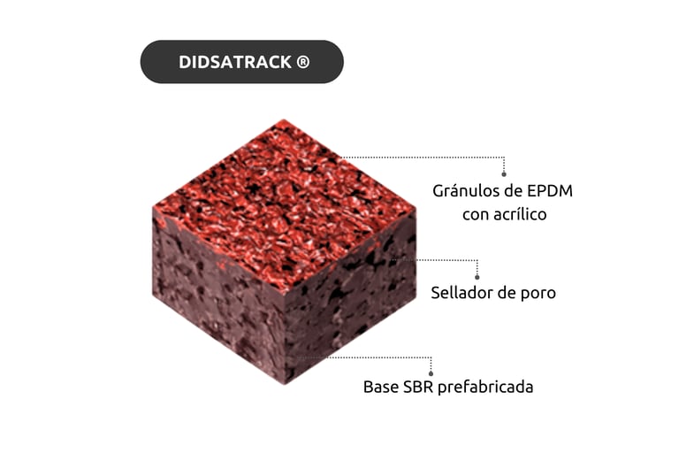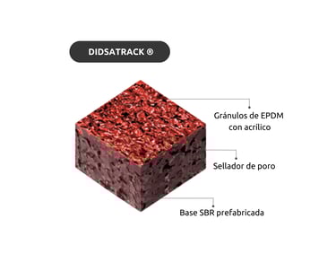 Es un concentrado de polímero 100 % acrílico altamente pigmentado, relleno con caucho EPDM de color para usar en asfalto nuevo o sobre superficies de color existentes, incluidos látex y S.A.R. pistas. La aplicación se realizará con una espátula de caucho de neopreno o con un aparato rociador capaz de rociar gránulos rellenos de caucho suspendidos en un aglutinante acrílico. El asfalto debe estar completamente curado (30 días) antes de aplicar el sistema DIDSATRACK®. Ideal para hacer que una pista de atletismo o trotapista antigua parezca nueva o para usarse en construcciones nuevas.