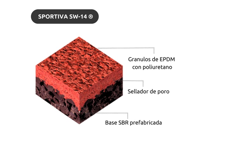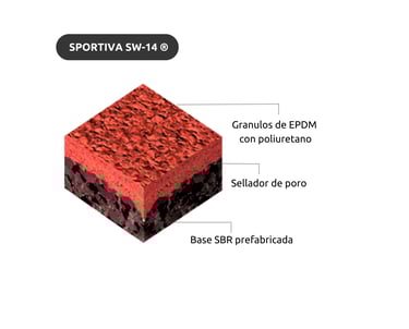 El sistema de superficie SPORTIVA SW-14® es un sistema sándwich duradero resistente a la abrasión, intemperie y a cambios de clima. El sistema de dos capas cuenta con una base prefabricada, fabricada según estándares exigentes, que se sella con un sellador de poros de poliuretano y se termina con una capa de desgaste de poliuretano de color sin costuras que se esparce con gránulos de EPDM en color a elegir.