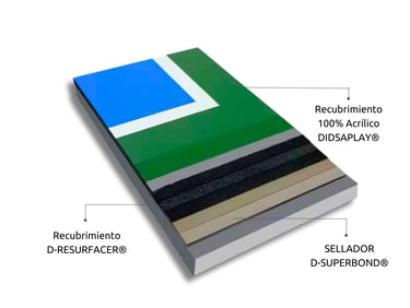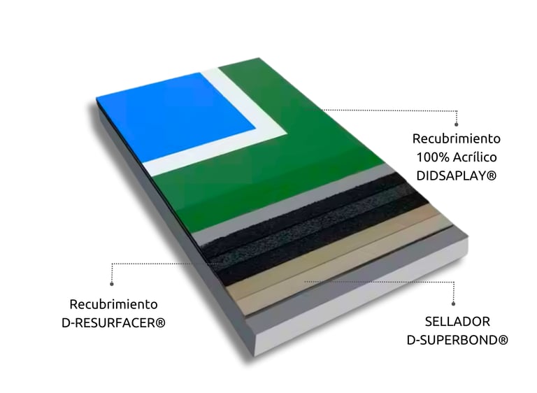 RECUBRIMIENTO ACRÍLICO DEPORTIVO DIDSAPLAY®, EN COLOR A ELEGIR, FORMULADO CON PIGMENTOS RESISTENTES A RAYOS UV Y MEZCLADO CON ARENA SÍLICA CALIBRADA, PARA PROPORCIONAR UN ACABADO TEXTURIZADO Y ANTIDERRAPANTE, IDEAL PARA SUPERFICIES DE ALTO RENDIMIENTO DEPORTIVO RESISTENTE A LA INTEMPERIE Y ABRASIÓN.